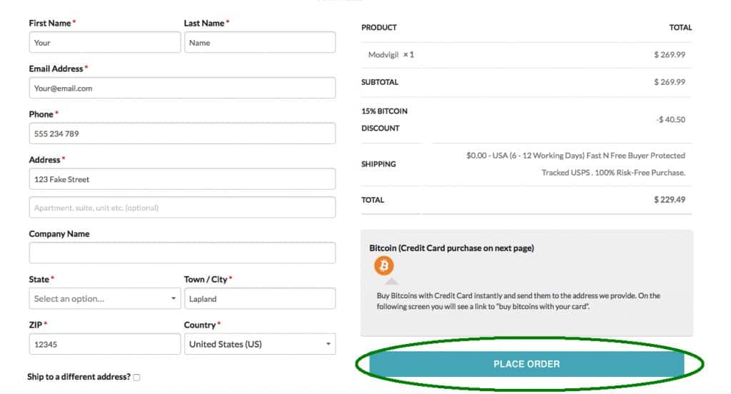 First of all choose your desired product and amount. Fill in your details and press the PLACE ORDER button circled in GREEN