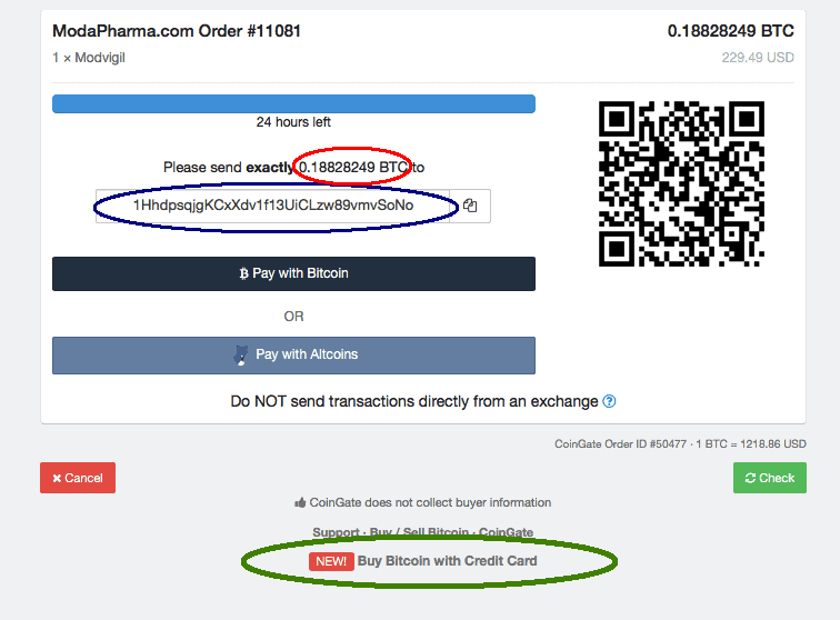 Once you have clicked place order you will see, the page below. At the bottom of the page, a link that says Buy Bitcoin with Credit Card circled in GREEN. Press this button which will open a new window.